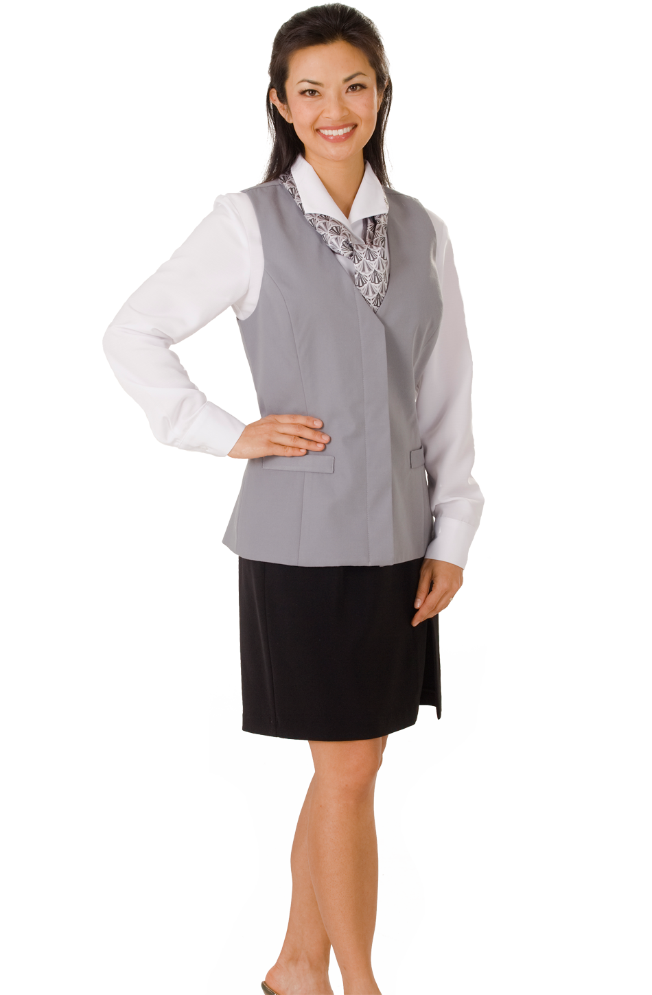 Covered placket vest with a female cut has fake welt pockets and is fully lined. Can be made with an optional hidden or back adjustable belt. Companion style: Male Roosevelt vest