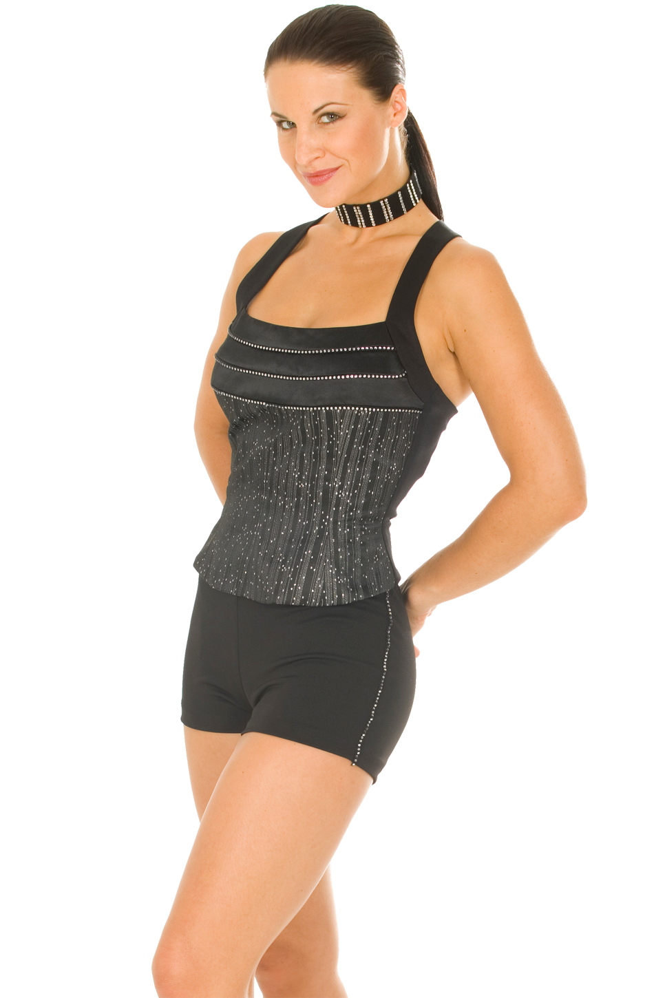Design meets functionality. This flattering bustier immediately sets that perfect tone in your facility. It can be fun and playful worn with shorts, flirtatious with a skirt, or the epitome of elegance with the matching long pants. The bustier can be made with either rhinestone trim or regular piping.